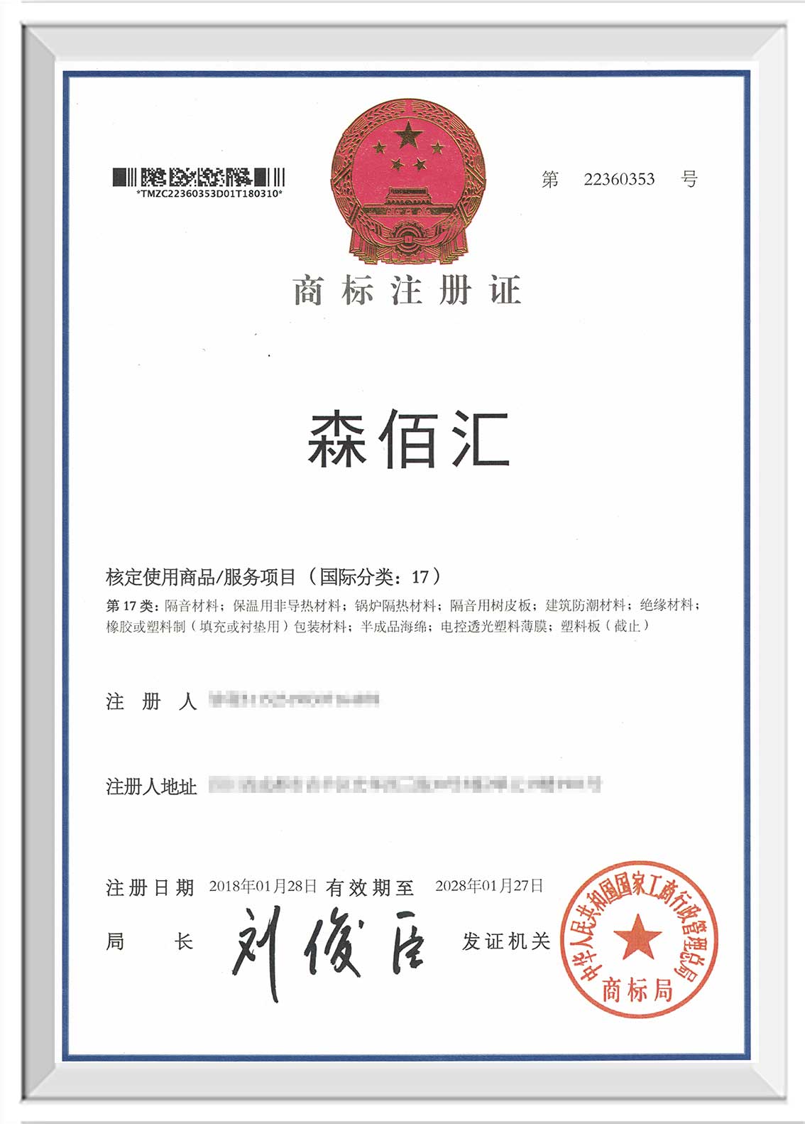 宜昌“森佰汇”商标证书下发至企业